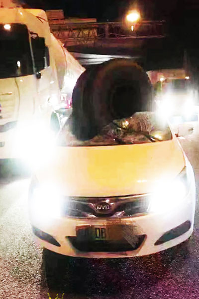 Opona, która urwała się z jadącej ciężarówki, zgodnie z prawami fizyki wyleciała do przodu. Tylko jej tor ruchu był dość zaskakujący. Kierowca przeżył – skończyło się na kilku siniakach i rozwalonym aucie.